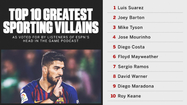 หลุยส์ ซัวเรซ กองหน้า บาร์เซโลน่า ได้รับการโหวตจากแฟนกีฬาให้รับตำแหน่งตัวโกงอันดับหนึ่ง จากทุกประเภท ด้วยพฤติกรรมสุดห่ามในสนามตั้งแต่อดีตถึงปัจจุบัน โดยผลงานส่วนใหญ่เกิดใต้สีเสื้อทีมชาติอุรุกวัยและสโมสร ลิเวอร์พูล