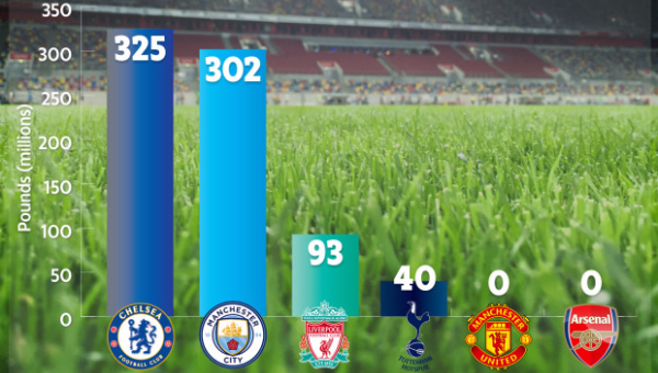 ขณะที่ทีมใหญ่อื่นอย่าง เชลซี ก็มีเงินมากถึง 325 ล้านปอนด์จาก โรมัน อบราโมวิช เจ้าของทีมที่อัดเข้าสู่สโมสรในรูปแบบ เงินกู้ยืมจากเจ้าของกิจการ (owner loans) ตลอด 5 ปีที่ผ่านมา