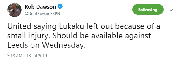 'ปีศาจแดง' ซึ่งเวลานี้อยู่เมืองเพิร์ท เตรียมเตะอุ่นเครื่อง 2 เกม โดยเริ่มจากคลับฟุตบอลท้องถิ่น ต่อด้วย ลีดส์ ยูไนเต็ด ( 17 ก.ค.) ทว่าไม่ปรากฎเงาของ ลูกากู ในตั้งแต่การซ้อมวันพฤหัสบดี, วันศุกร์ และต่อเนื่องถึงแมตช์เดย์