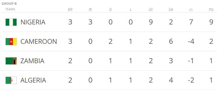 จากชัยชนะเกมนี้ทำให้ไนจีเรียมี 9 คะแนนเต็ม นำโด่งเป็นจ่าฝูงของกลุ่ม บี ขณะที่ แคเมอรูน แข่ง 3 นัดเพิ่งมีแค่ 2 คะแนนเท่านั้น