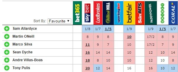 ร้านพูลอย่าง สกาย เบท เปิดราคาไว้ที่ 1/8 (แทง 8 ได้ 1 ไม่รวมทุน) สำหรับการได้รับงานคุมทีมเอฟเวอร์ตันซึ่งแสดงให้เห็นว่ามีโอกาสสูงเหลือเกิน ขณะที่ แล็ดโบรกส์ และ วิลเลี่ยม ฮิลล์ ก็เปิดราคาไว้ใกล้เคียงกันที่ 1/7 และ 1/5 ตามลำดับ