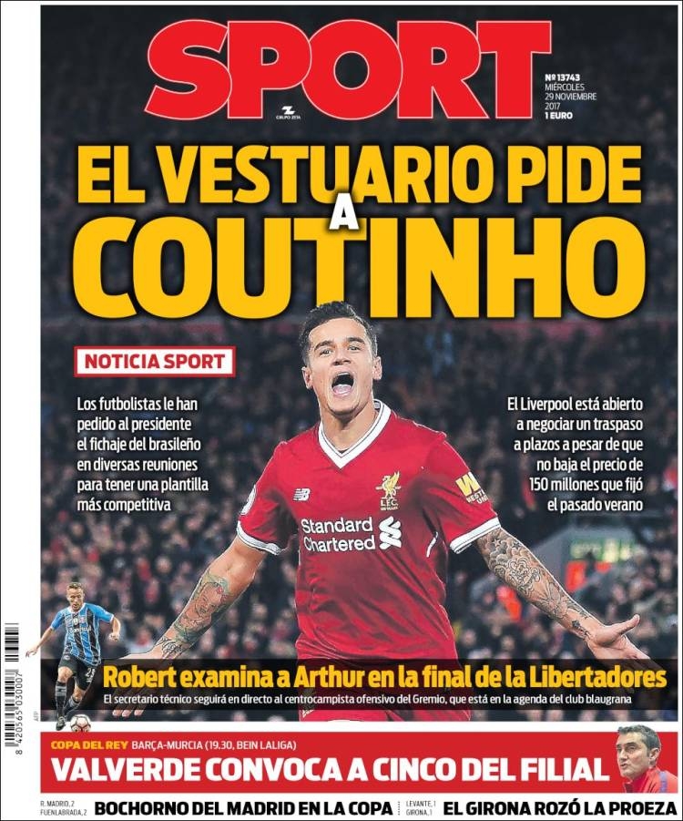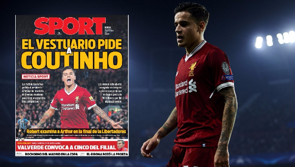 'สปอร์ต' สื่อโปรกาตาลัน จับประเด็นของ ฟิลิปเป้ คูตินโญ่ ขึ้นหน้าหนึ่งฉบับวันพุธที่ 29 พ.ย.ว่า นักเตะสามารถตกลงกับฝ่ายบริหาร ลิเวอร์พูล เพื่อขอย้ายทีมได้แล้ว
