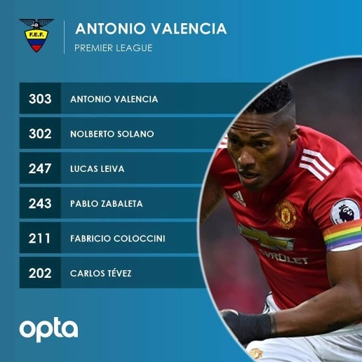 ปีกเอกวาดอร์ ที่ปัจจุบันเอาดีตำแหน่งแบ็กขวากับ แมนเชสเตอร์ ยูไนเต็ด เพิ่งลงเล่นเกมพรีเมียร์ลีกเป็นนัดที่ 303 ทำสถิติเป็นนักเตะอเมริกาใต้ที่ลงเล่นมากที่สุดเรียบร้อย แซงผ่าน โนลเบร์โต้ โซลาโน่ อดีตปีกเปรูของ นิวคาสเซิ่ล