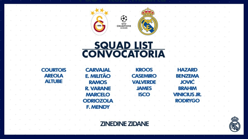 อย่างไรก็ตาม ซีดาน ยังมีข่าวดีเมื่อได้ เอแด็น อาซาร์, โทนี่ โครส และ ดานี่ การ์บาฆาล กลับมามีชื่ออีกอยู่ในโผ 21 แข้งชุดเตรียมเดินทางไปตุรกีเพื่อลงเล่นกับ กาลาตาซาราย ในวันอังคารที่ 22 ตุลาคมนี้