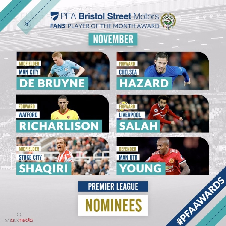 โดยแข้งรายอื่นที่ถูกเสนอชื่อประกอบด้วย เควิน เดอ บรอยน์ (แมนฯ ซิตี้), เซอร์ดาน ชิกิรี่ (สโต๊ค), แอชลี่ย์ ยัง (แมนฯ ยูไนเต็ด) และ ริคาร์ลิซอน (วัตฟอร์ด)