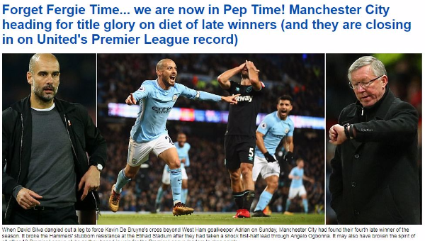 'เดลี่ เมล' สื่อดังของอังกฤษทำบทวิเคราะห์ถึงความสำเร็จของ โจเซป กวาร์ดิโอล่า ในการลงเล่นพรีเมียร์ลีกสามเกมหลังสุด ที่สามารถทำประตูหลังนาที 80 โดยถูกเปรียบเทียบกับเมื่อครั้งความสำเร็จของ เซอร์ อเล็กซ์ เฟอร์กูสัน เมื่อครั้งคุมทัพ แมนฯ ยูไนเต็ด