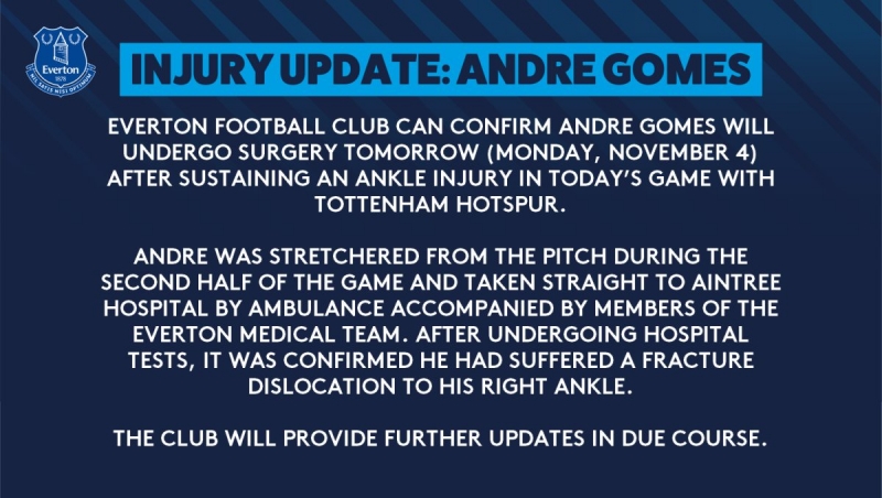 เอฟเวอร์ตัน ได้ออกแถลงการณ์ล่าสุดว่า "สโมสรเอฟเวอร์ตัน ขอยืนยันว่า อันเดร โกเมส จะเข้ารับการผ่าตัดในวันพรุ่งนี้ (จันทร์, 4 พฤศจิกายน) หลังได้รับบาดเจ็บข้อเท้าหักในเกมวันนี้กับ ท็อตแน่ม ฮอตสเปอร์"