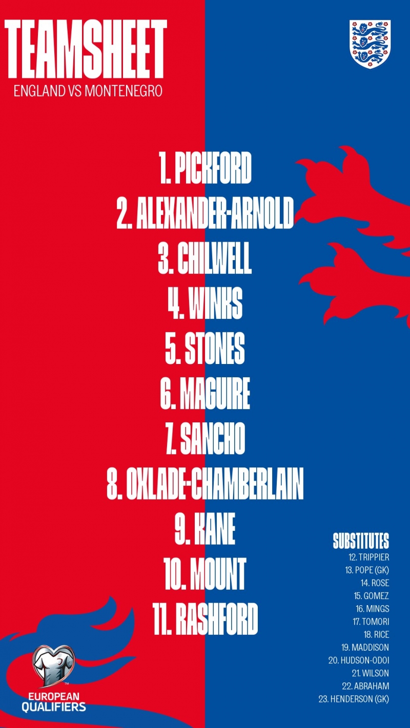 รายชื่อตัวจริงของทีมชาติอังกฤษนัดล่าสุดซึ่งเป็นการแข่งขันระดับนานาชาตินัดที่ 1,000 ประกอบด้วย จอร์แดน พิคฟอร์ด ในตำแหน่งผู้รักษาประตู กองหลังมี เทรนท์ อเล็กซานเดอร์ อาร์โนลด์, แฮร์รี่ แม็กไกวร์, จอห์น สโตนส์ และ เบน ชิลเวลล์ ทำหน้าที่ร่วมกัน