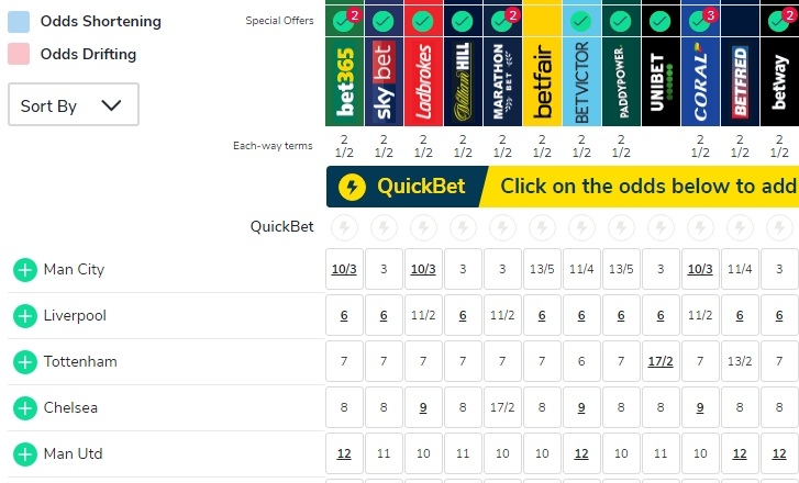 ส่วนรองๆลงมาจากนั้นไล่เรียงจาก เชลซี (8/1) < แมนฯ ยูไนเต็ด ( 11/1) < อาร์เซน่อล (12/1) < เลสเตอร์ (14/1) < วูล์ฟส์ ( 18/1)