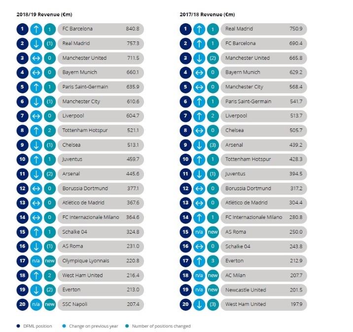 อนึ่งปีการประเมินว่ารายได้ของ ยูไนเต็ด ฤดูกาล 2019-20 จะลดลงระหว่าง 560-580 ล้านปอนด์ เพราะชวดรายได้จากค่าลิขสิทธิ์ถ่ายทอดสด แชมเปี้ยนส์ ลีก ทำให้เชื่อว่าการประกาศลำดับในปีหน้าอาจโดนเขย่าบัลลังก์