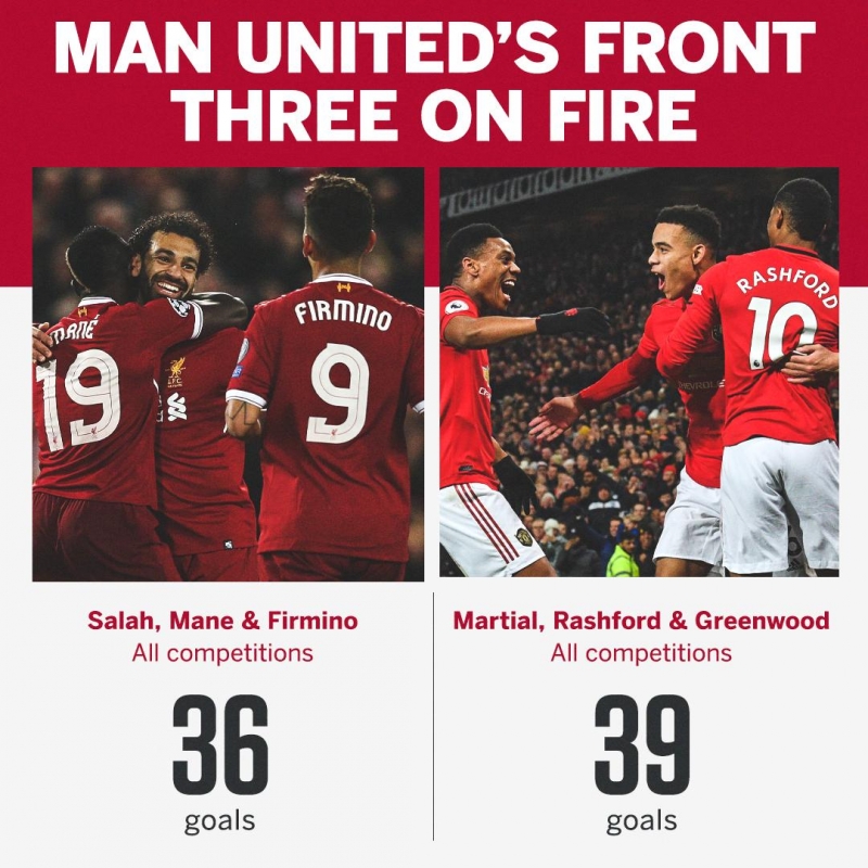 ใน 39 ประตูของ 3 ตัวรุก แมนฯ ยูไนเต็ด แรชฟอร์ด ยิงได้มากสุด 19 ประตู ตามด้วย มาร์กซิยาล 11 ประตู และ กรีนวู้ด หัวหอกดาวรุ่งวัย 18 ปียิงไป 9 ประตู