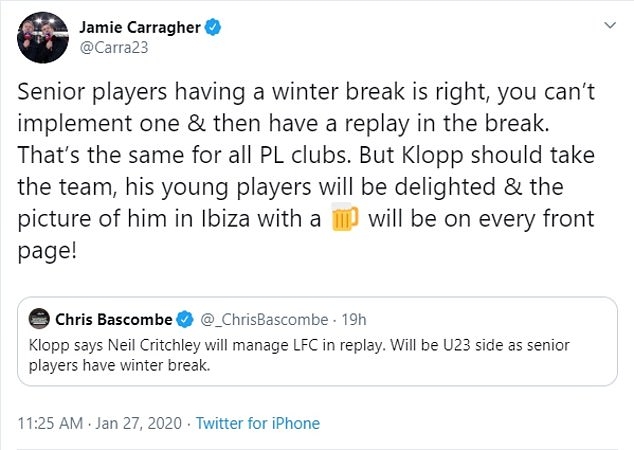 "ผู้เล่นชุดใหญ่จะได้พักช่วงเบรกหน้าหนาวเป็นเรื่องที่ถูกต้องแล้ว" ทวีตผ่าน @Carra23