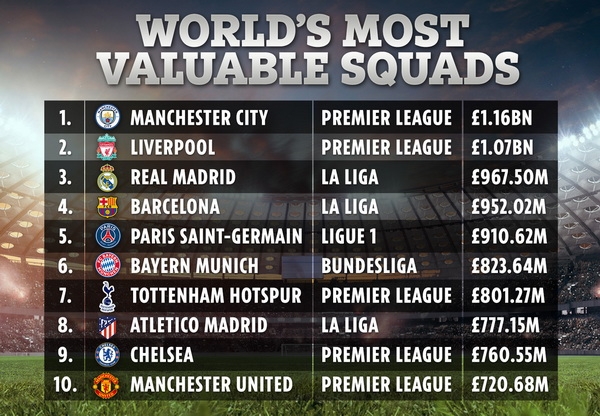 ปารีส แซงต์-แชร์กแม็ง ที่มี 2 แข้งมูลค่ามหาศาลอย่าง คีลิยัน เอ็มบั๊ปเป้ ที่ 162 ล้านปอนด์ และ เนย์มาร์ 198 ล้านปอนด์ แต่ก็รั้งอันดับ 5 ที่มูลค่า 910.62 ล้านปอนด์