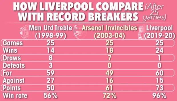 ทั้งนี้จากการเปิดเผยสถิติของ เดอะ ซัน ชี้ให้เห็นว่า หงส์แดง ชุดนี้ของ เจอร์เก้น คล็อปป์ มีสถิติที่ดีกว่าทั้ง ปิศาจแดง ชุดคว้า 3 แชมป์ในปี 1998/99 และ อาร์เซน่อล ชุดไร้พ่ายในซีซั่น 2003/04