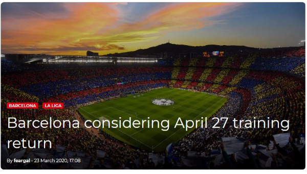 บาร์เซโลน่า ทีมดังแห่ง ลา ลีกา วางแผนกลับมาลงซ้อมอีกครั้งในวันที่ 27 เมษายน แม้ไม่รู้ว่าการแข่งขันจะกลับมาฟาดแข้งได้อีกเมื่อไหร่