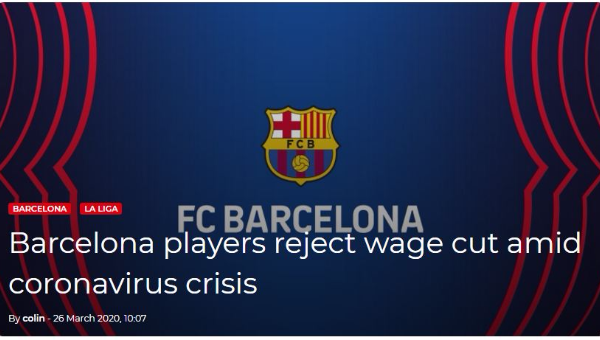 นักเตะบาร์เซโลน่า ปฏิเสธยอมรับข้อตกลงให้ลดค่าเหนื่อยลงตามข้อเรียกร้องของสโมสรที่กำลังเผชิญหน้ากับวิกฤตทางการเงินจากการแพร่ระบาดของไวรัสโควิด-19