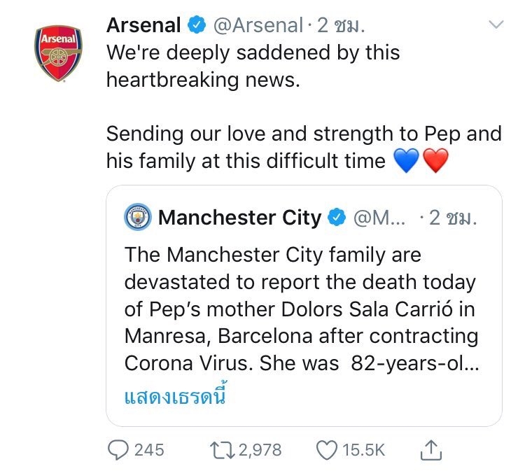 ด้าน อาร์เซน่อล มีข้อความถึงกุนซือ แมนฯ ซิตี้ เช่นกันว่า "เราเสียใจอย่างสุดซึ้งต่อข่าวอันเศร้าสะเทือนใจนี้ ขอส่งความรักและความแข็งแกร่งของเราไปถึง เป๊ป และครอบครัวของเขาในช่วงเวลาอันยากลำบากนี้"
