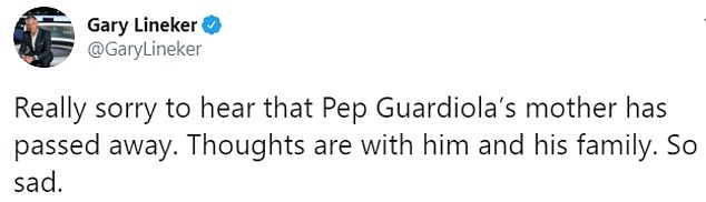 ด้าน ลิเนเกอร์ ใช้บัญชี @GaryLineker ทวีตว่า "เสียใจอย่างสุดซึ้งเมื่อทราบข่าการเสียชีวิตของมารดา เป๊ป กวาร์ดิโอล่า ขอส่งกำลังใจให้เขารวมถึงครอบครัวด้วย เศร้าจริงๆ"
