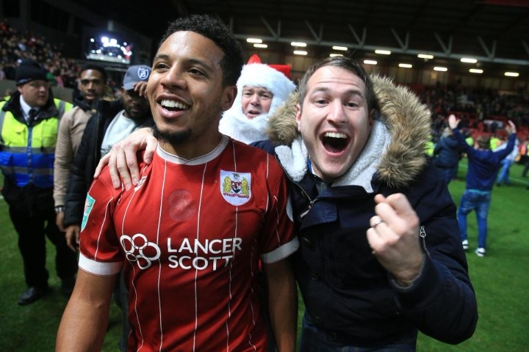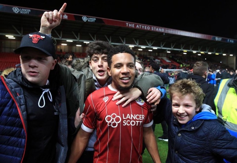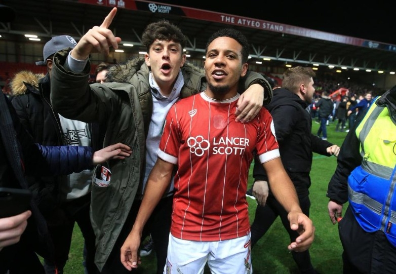 คอรี่ย์ สมิธ ฮีโร่ของ บริสตอล ซิตี้ ได้ยืนถ่ายรูปกับแฟนบอลอย่างเป็นกันเองหลังจากเพิ่งเปิดบ้านเอาชนะ แมนเชสเตอร์ ยูไนเต็ด 2-1 เมื่อวันพุธที่ผ่านมา