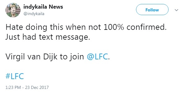 "อาจจะยังไม่ยืนยัน 100% แต่ได้รับข้อความว่า เฟอร์จิล ฟาน ไดจ์ค จ่อร่วมทีม @LFC (บัญชีสโมสร ลิเวอร์พูล)"