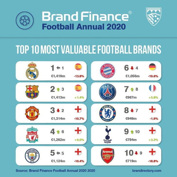 สำหรับท็อป 10 โลกมีสโมสรจากอังกฤษเข้ามาอีก 4 ทีมได้แก่ อันดับ 5 แมนฯ ซิตี้ 1.017 พันล้านปอนด์ (-10.4%), อันดับ 8 เชลซี 859 ล้านปอนด์ (-1.9%), อันดับ 9 ท็อตแน่ม 709.5 ล้านปอนด์ (+3.3%) และอันดับ 10 อาร์เซน่อล 650.75 ล้านปอนด์(-18.8%)