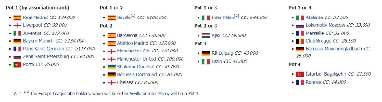 ด้าน ลิเวอร์พูล แชมป์พรีเมียร์ลีก อังกฤษ แม้เป็นทีมวางในโถ 1 แต่ก็มีโอกาสเจอกรุ๊ป ออฟ เดธ เช่นกัน หากผลจับติ้วคือ บาร์เซโลน่า (โถ 2), อาแจ็กซ์ (โถ 3) และ อตาลันต้า (โถ 4)