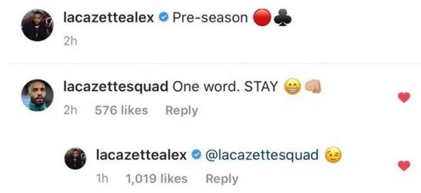 อเล็กซองด์ ลากาแซ็ตต์ กองหน้า อาร์เซน่อล บอกใบ้ว่าเขาจะอยู่กับสโมสรต่อไป ท่ามกลางข่าวย้ายทีม โดยมีทั้ง ยูเวนตุส และ แอต. มาดริด ที่ให้ความสนใจ