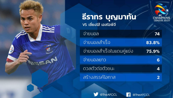 เผยสถิติ ธีราทร บุญมาทัน แบ็คซ้ายโยโกฮามา เอฟ มารินอส ในเกมเอเอฟซี แชมเปี้ยนส์ลีก ที่เอาชนะเซี่ยงไฮ้ เอสไอพีจี 1-0