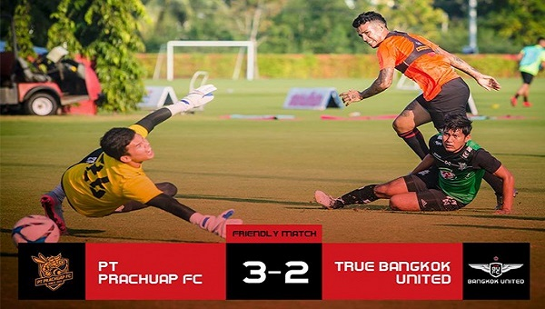 การแข่งขันฟุตบอลอุ่นเครื่อง ประจำวันเสาร์ที่ 13 มกราคม ณ สนามฝึกซ้อม ทรู อารีน่า หัวหิน สถานที่เก็บตัวทัพแข้งเทพ คู่ระหว่าง แบงค็อก ยูไนเต็ด ยักษ์ใหญ่ไทยลีก พบ พีที ประจวบ เอฟซี น้องใหม่ไทยลีก