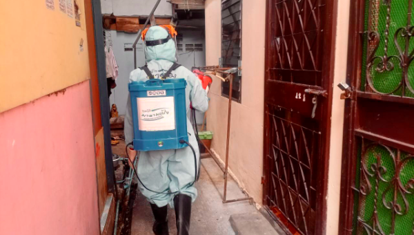 มูลนิธิมาดามแป้ง ทำงานเชิงรุกรุดลงพื้นที่ชุมชนบ่อนไก่พัฒนา เขตปทุมวัน อาสาฉีดพ่นน้ำยาฆ่าเชื้อโควิด-19 ทันทีหลังพบผู้ติดเชื้อสูงจากการตรวจเชิงรุกต่อเนื่อง