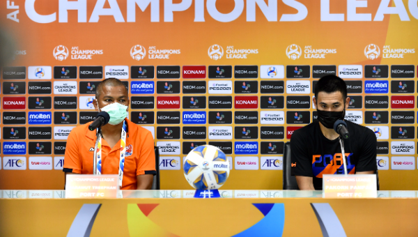 สระราวุฒิ ตรีพันธ์ กุนซือสิงห์เจ้าท่า และ ปกรณ์ เปรมภักดิ์ ให้สัมภาษณ์หลังเกม การท่าเรือ เอฟ.ซี. รัวยิง กว่างโจว เอฟ.ซี. 3-0 ศึก เอเอฟซี แชมเปี้ยนส์ ลีก 2021 รอบแบ่งกลุ่ม กลุ่ม เจ นัดที่สอง
