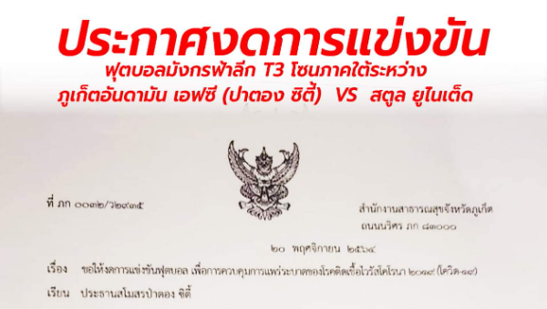 ประกาศงดการแข่งขันฟุคบอลมังกรฟ้าลีก คู่ระหว่าง ภูเก็ตอันดามัน เอฟซี (ป่าตอง ซิตี้) vs สตูล ยูไนเต็ด