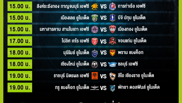 • โปลิศ เทโร เอฟซี (ไทยลีก 1) พบ ขอนแก่น ยูไนเต็ด (ไทยลีก 1) ที่สนามกีฬาบุณยะจินดา เวลา 17.00 น. (AIS PLAY ถ่ายทอดสด)