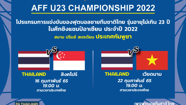 สหพันธ์ฟุตบอลอาเซียน หรือ เอเอฟเอฟ แจ้งโปรแกรมการแข่งขันฟุตบอล ศึกชิงแชมป์อาเซียน รุ่นอายุไม่เกิน 23 ปี ประจำปี 2022