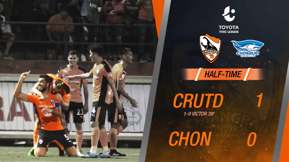น.39 สิงห์ เชียงราย ยูไนเต็ดได้ประตูขึ้นนำ 1-0 จากจังหวะเตะมุมทางฝั่งขวาอี ยอง-แร เปิดมาหน้าประตู วิคเตอร์ คาร์โดโซ่ ได้โหม่งบอลติดแนวรับชลบุรี แต่ยังมาเข้าทางเจ้าตัวอีกครั้ง ยิงสวนมุมแคบที่เสาแรกบอลพุ่งตุงตาข่ายเข้าไปชนิดที่ชนินทร์ แซ่เอียะหมดสิทธิ์เซฟ ก่อนจบครึ่งแรกด้วยสกอร์นี้