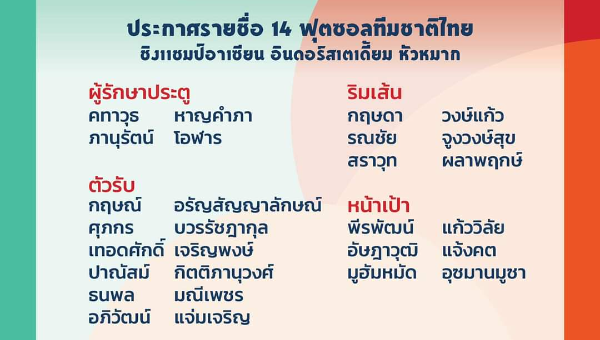 ส.ฟุตบอลไทยฯ ประกาศรายชื่อ 14 แข้ง "โต๊ะเล็กช้างศึก" ชุดป้องกันแชมป์อาเซียนสมัยที่ 16 ระหว่าง 2-10 เม.ย.65 นี้
