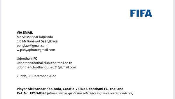 ฟีฟ่า (FIFA) ได้ ยืนยันคำตัดสิน (Deisicon) อย่างเป็นทางการ เรียบร้อยแล้วเมื่อวันที่ 9 ธันวาคม 2565 ตามที่ นายอเล็ก ซานดร้า คาปิโช่ช่า Alex Sandra Ka pisola อดีตผู้เล่น สโมสร อุดรธานีเอฟซี ได้มีการยื่นเรืองฟ้องร้องกับฟีฟ่า เกี่ยวกับเงินค่าจ้าง ค้างจ่าย จำนวน 785,000 บาท