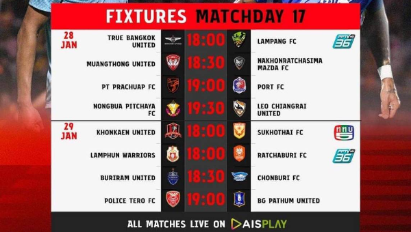 18.30 น. ขอนแก่น ยูไนเต็ด พบ สุโขทัย เอฟซี สนามกีฬาองค์การบริหารส่วนจังหวัดขอนแก่น ถ่ายทอดสด CH5/ AIS PLAY