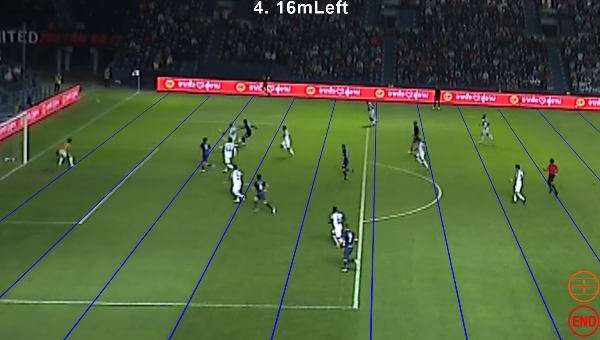 - จากมุมกล้อง 18 หลา (ภาพที่ 1) ที่สามารถตีเส้นได้ ทาง VAR ได้มีการตีเส้นที่เท้าของ เรนาโต้ เคลิช กองหลังชลบุรี เอฟซี ตัวสุดท้าย ที่กำลังเหยียดขาเพื่อบล็อคจังหวะยิงของ ศุภณัฏฐ์ เหมือนตา โดยหากมองจากการตีเส้นแล้ว จะเห็นว่าเท้าของศุภชัย ใจเด็ด ยังอยู่ในไลน์ไม่เกินเท้าของผู้เล่นชลบุรี