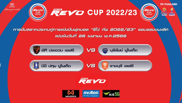 วันที่ 28 กุมภาพันธ์ 2565 เวลา 14.00 น. ณ ชั้น 24 อาคารเฉลิมพระเกียรติ การกีฬาแห่งประเทศไทย สมาคมกีฬาฟุตบอลแห่งประเทศไทยฯ, บริษัท ไทยลีก จำกัด ร่วมกับ บริษัท โตโยต้า มอเตอร์ ประเทศไทย จำกัด จัดพิธีการจับสลากประกบคู่ รีโว่ คัพ ฤดูกาล 2022/23 รอบรองชนะเลิศ