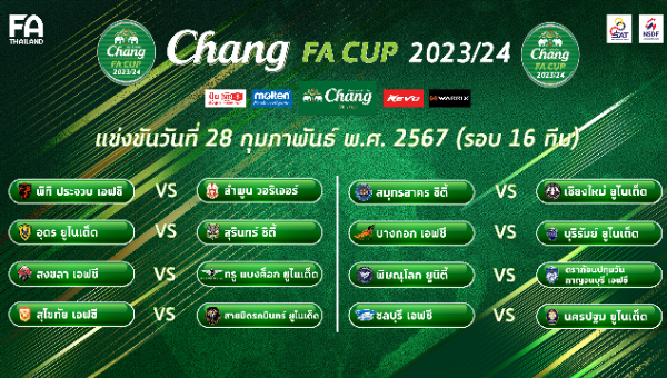 สำหรับ ช้าง เอฟเอ คัพ 2023/24 รอบ 16 ทีมสุดท้าย จะทำการแข่งขันในวันพุธที่ 28 กุมภาพันธ์ 2567 โดยเป็นการแข่งขันแบบน็อคเอาท์ แพ้คัดออก หากหมดเวลาการแข่งขันแล้วทั้งสองทีมยังเสมอกัน จะทำการต่อเวลาพิเศษครึ่งละ 15 นาที และหากยังไม่ทราบผลแพ้ชนะ จะตัดสินด้วยการเตะลูกโทษ ณ จุดโทษ เพื่อหาผู้ชนะเข้ารอบต่อไป