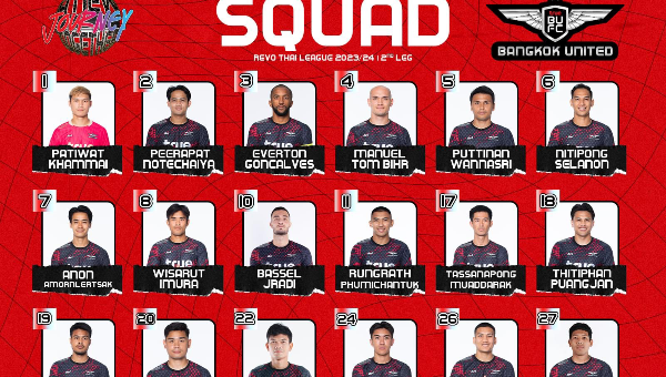 รายชื่อพร้อมหมายเลขนักเตะ ทรู แบงค็อก ยูไนเต็ด ชุดลุยศึกรีโว่ ไทยลีก 2023/24 เลกที่สอง