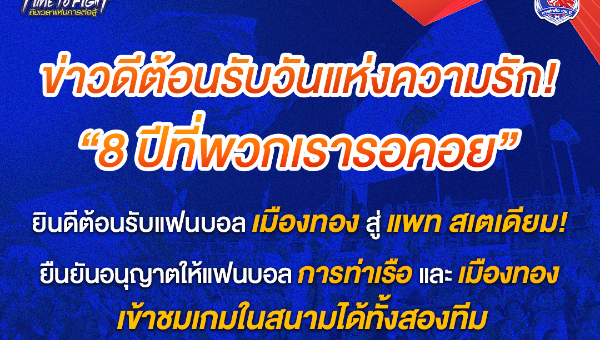 ประกาศยืนยันข่าวดีต้อนรับวันแห่งความรัก  8 ปีที่พวกเรารอคอย  สิ้นสุดลงแล้ว! 14 กุมภาพันธ์นี้ เมื่อการท่าเรือ เอฟซี ยินดีต้อนรับแฟนบอลเมืองทอง ยูไนเต็ด กลับมาเข้ามาชมเกมที่ แพท สเตเดียม ได้อีกครั้ง