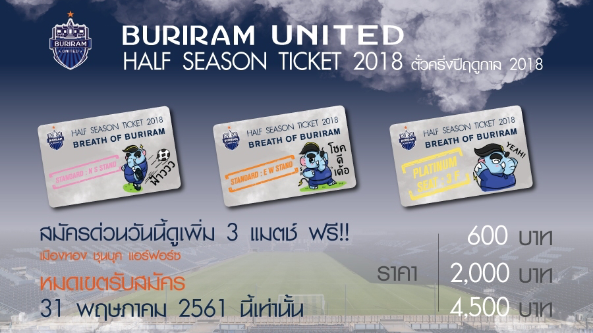 บุรีรัมย์ ยูไนเต็ด ทีมจ่าฝูงศึกโตโยต้า ไทยลีก 2018 เตรียมเปิดขายตั๋วครึ่งปี ฤดูกาล 2018 ราคาโดนใจ พร้อมรับสิทธิ์พิเศษเกินราคา เริ่มขายตั้งแต่ บัดนี้ - 31 พฤษภาคม 2561