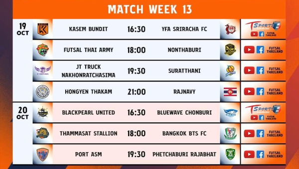 MEA ฟุตซอลไทยลีก 2024 นัดสุดท้ายเลกแรก นัดที่ 13 สุดสัปดาห์นี้ มีแข่งขันในวันเสาร์ 19 ต.ค.67 และวันอาทิตย์ 20 ต.ค.67 ซึ่งถือเป็นเกมสุดท้ายเลกแรกก่อนที่จะพักเบรกให้ทีมฟุตซอลทีมชาติไทยสู้ศึก เอเอฟเอฟ 2024 ที่ เทอมิน่อล21โคราช จ.นครราชสีมา วันที่ 2-10 พ.ย.67
