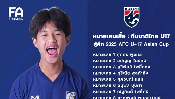 ฟุตบอลชายทีมชาติไทย รุ่นอายุไม่เกิน 17 ปี ประกาศหมายเลขเสื้อ นักกีฬาทั้ง 23 คน สำหรับทำการแข่งขันฟุตบอลชิงแชมป์เอเชีย รุ่นอายุไม่เกิน 17 ปี รอบสุดท้าย (2025 AFC U-17 Asian Cup) ที่ ซาอุดีอาระเบีย ระหว่างวันที่ 3-20 เมษายน 2568