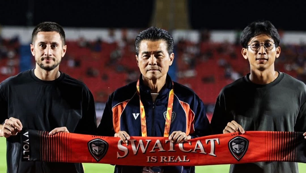 นายเทวัญ ลิปตพัลลภ ประธานบริหารสโมสร "สวาทแคท" นครราชสีมา มาสด้า เอฟซี ร่วมเปิดตัว เควนติน กอร์เน็ตต์ แนวรุกชาวฝรั่งเศส และ เฮน พโย วิน แนวรับชาวเมียนมาร์ โดยจะเข้ามาเสริมความแข็งแกร่งในการแข่งขันเลกสอง