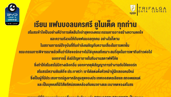 หลังจากมีประเด็นเดือดหลังนครศรี ยูไนเต็ด ประกาศปลดโค้ช ยอร์ก สไตน์บรุนเนอร์ นำมาซึ่งประเด็นที่ประธานสโมสรชาวต่างชาติ ทะเลาะกับแฟนบอลผ่านโซเชียล ล่าสุดทางสโมสรแถลงการณ์ว่า