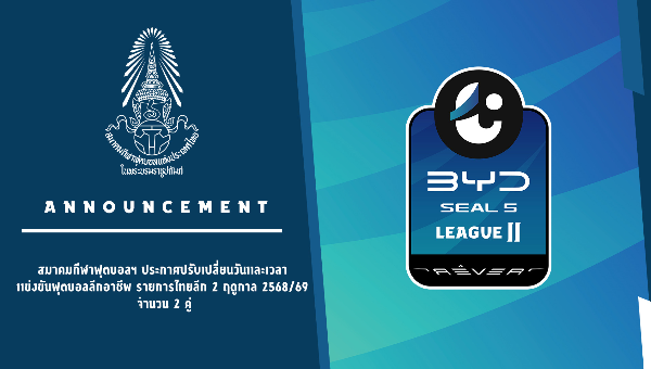 สมาคมกีฬาฟุตบอลแห่งประเทศไทย ในพระบรมราชูปถัมภ์ ประกาศปรับเปลี่ยนเวลาแข่งขันฟุตบอลลีกอาชีพ รายการไทยลีก 2 ฤดูกาล 2568/69 จำนวน 2 คู่