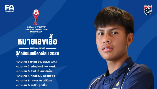 ประกาศ หมายเลขเสื้อ : 26 นักฟุตบอลชายทีมชาติไทยรุ่นอายุไม่เกิน 16 ปี ชุดสู้ศึกชิงแชมป์อาเซียน U17 ประจำปี 2026